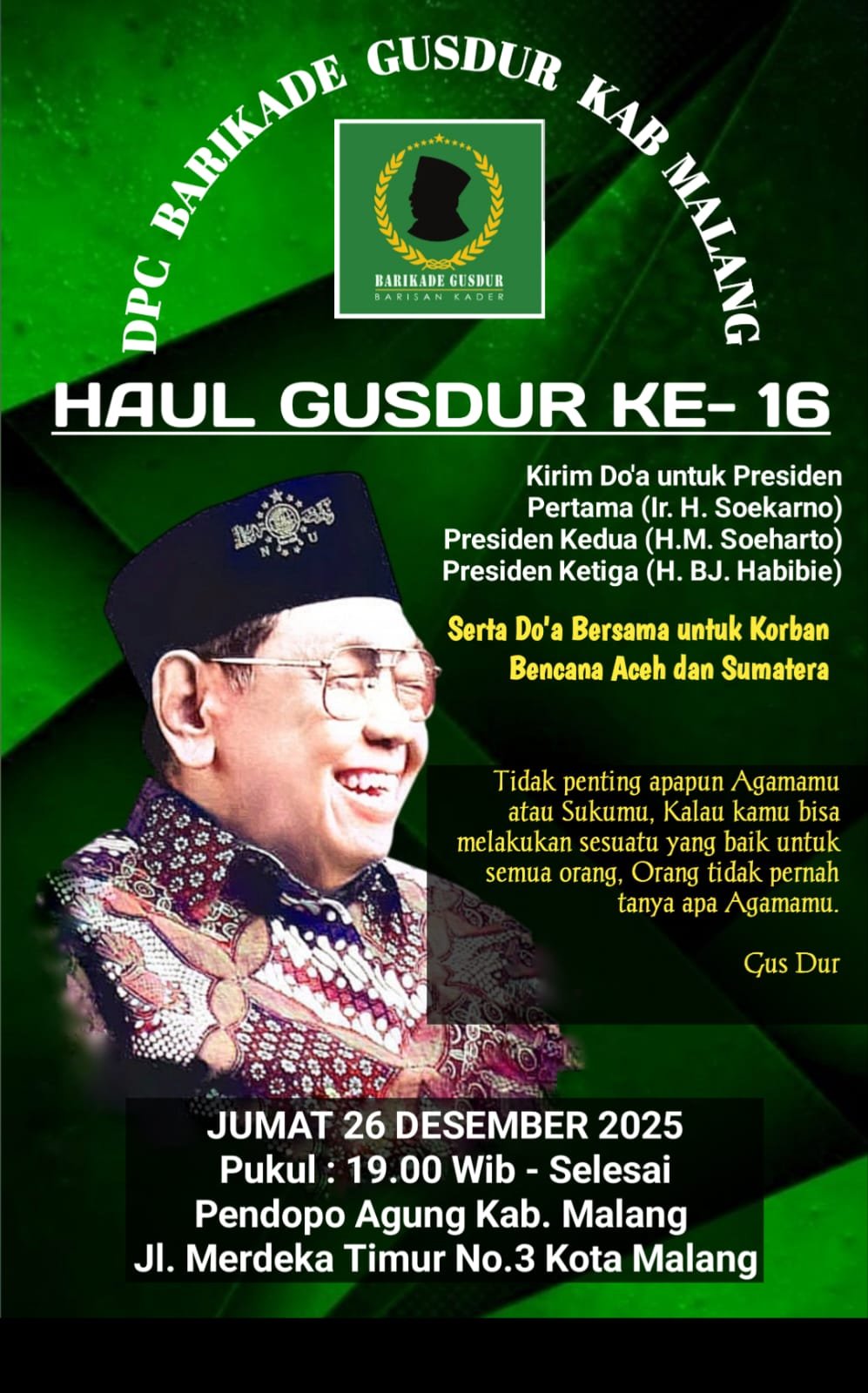 Malam haul ke-16 KH Abdurrahman Wahid di Pendopo Agung Kabupaten Malang bukan sekadar ritual tahunan. Ia adalah cermin—yang memaksa kita bercermin jujur: sejauh mana nilai-nilai Gus Dur masih hidup dalam praktik kehidupan berbangsa hari ini?